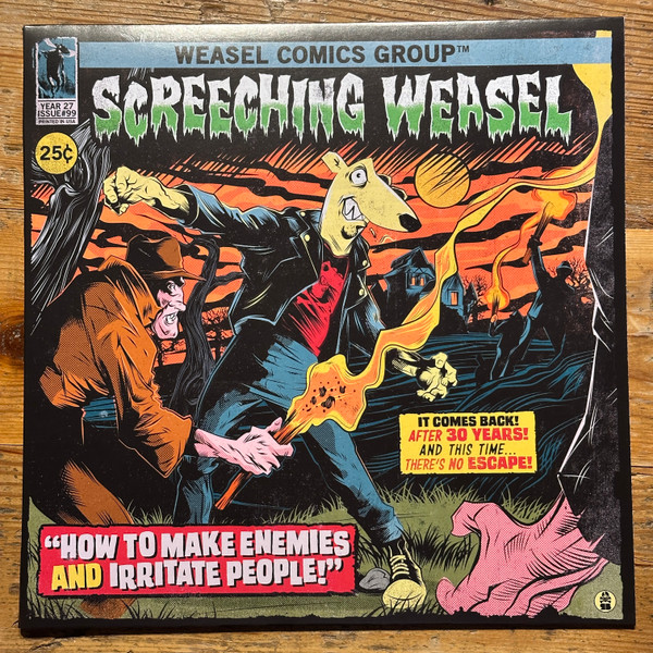 “How to Make Enemies and Irritate People” es el disco número 7 de la banda de punk rock de Chicago, los Screeching Weasel. Este fue el último álbum de la banda, también editado, como el de Avail, a través del sello Lookout Records. Poco tiempo después de terminar la grabación, edición y mezcla, se separaron, pero incluso, antes de terminar, el bajista y corista Dan Vapid se fue de la banda y en su reemplazo entró Mike Dirnt de Green Day. Claro que no duró mucho porque hacía poquito tiempo que con Green Day habían sacado el Dookie y les estaba yendo muy bien. Así que ese fue el final de los Screeching Weasel.El título de este disco, que traducido sería algo así como “Cómo hacer enemigos y fastidiar a la gente” es una parodia de un libro muy popular en esa época que se llamaba “Cómo ganar amigos e influenciar a la gente” y las tapas de los discos siempre tenían algo divertido y paródico también. En este, por ejemplo, en la contratapa aparecían los nombres de los temas pero versionados en broma. Por ejemplo, “I hate your guts on sunday” era «I Hate Yer Nuts on Monday» y la tapa seguía una estética muy particular, al estilo pelis sci-fi de los 50 o pulp fictions.